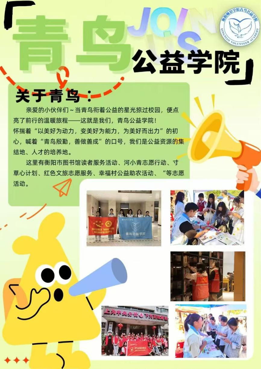 当金秋的风拂过,岸苇绽出素白新花,山梨叶染就烂漫丹色。正值金秋好时节,初入衡阳师范学院的你,是否仍对校园满怀着好奇?是否渴望在这里邂逅更多挚友,让自己的热爱如星火般闪耀?现在,青鸟公益学院招新的号角已然吹响,快跟上脚步,一同探寻成为学校“新”上人,在公益与成长中奔赴热爱的精彩吧~