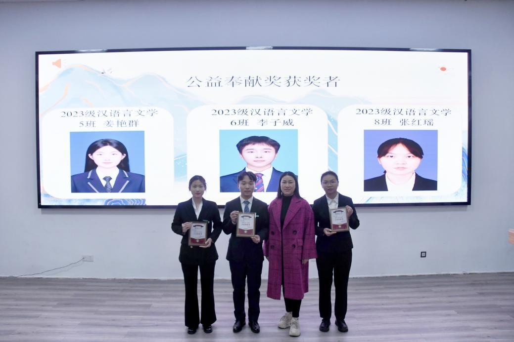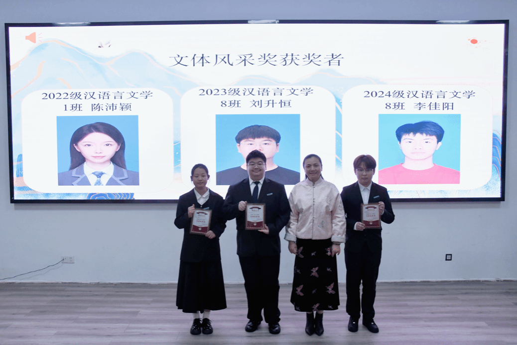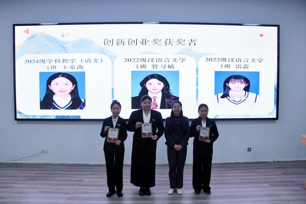 在之后进行的颁奖环节中,学院为各领域表现突出的学子分别颁发了创新创业奖、公益奉献奖、林植峰文学创作奖、文体风采奖、师范卓越奖、优秀团队奖及各项提名奖。每一项荣誉的授予,既是对同学们在创新创业、公益服务、文学创作、文体活动、师范技能及团队建设等方面突出表现的嘉奖与肯定,也是对全体文学院学子坚守文学热爱、勇毅前行的激励。