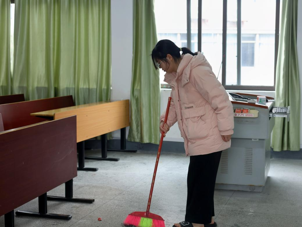 活动中,党员、团员、学生干部们分工明确、协同配合,细致清理地面垃圾,深入清扫桌椅缝隙及墙角等卫生死角,做到不留盲区、不留死角。大家干劲十足、配合默契,展现出昂扬向上的精神风貌。